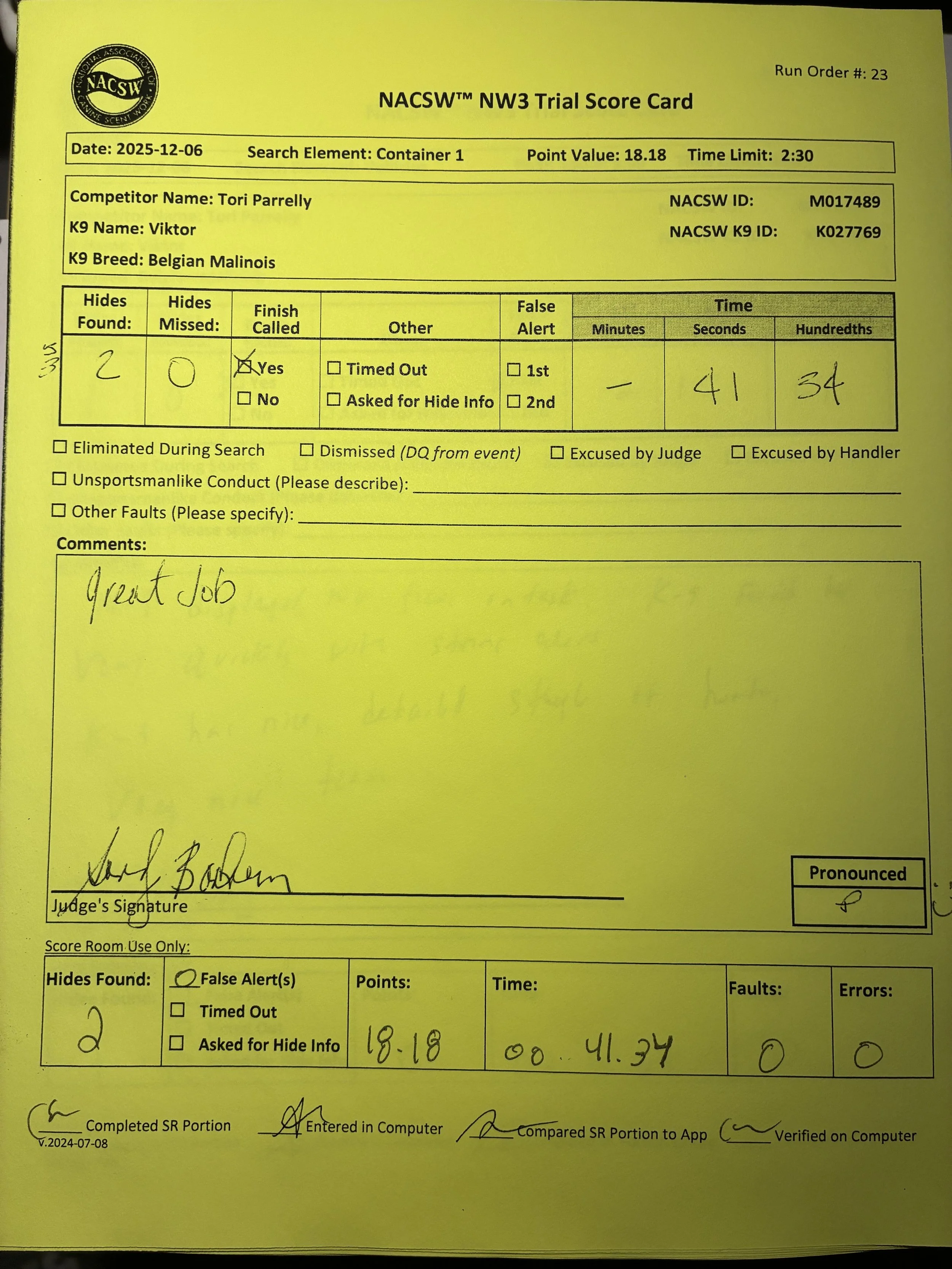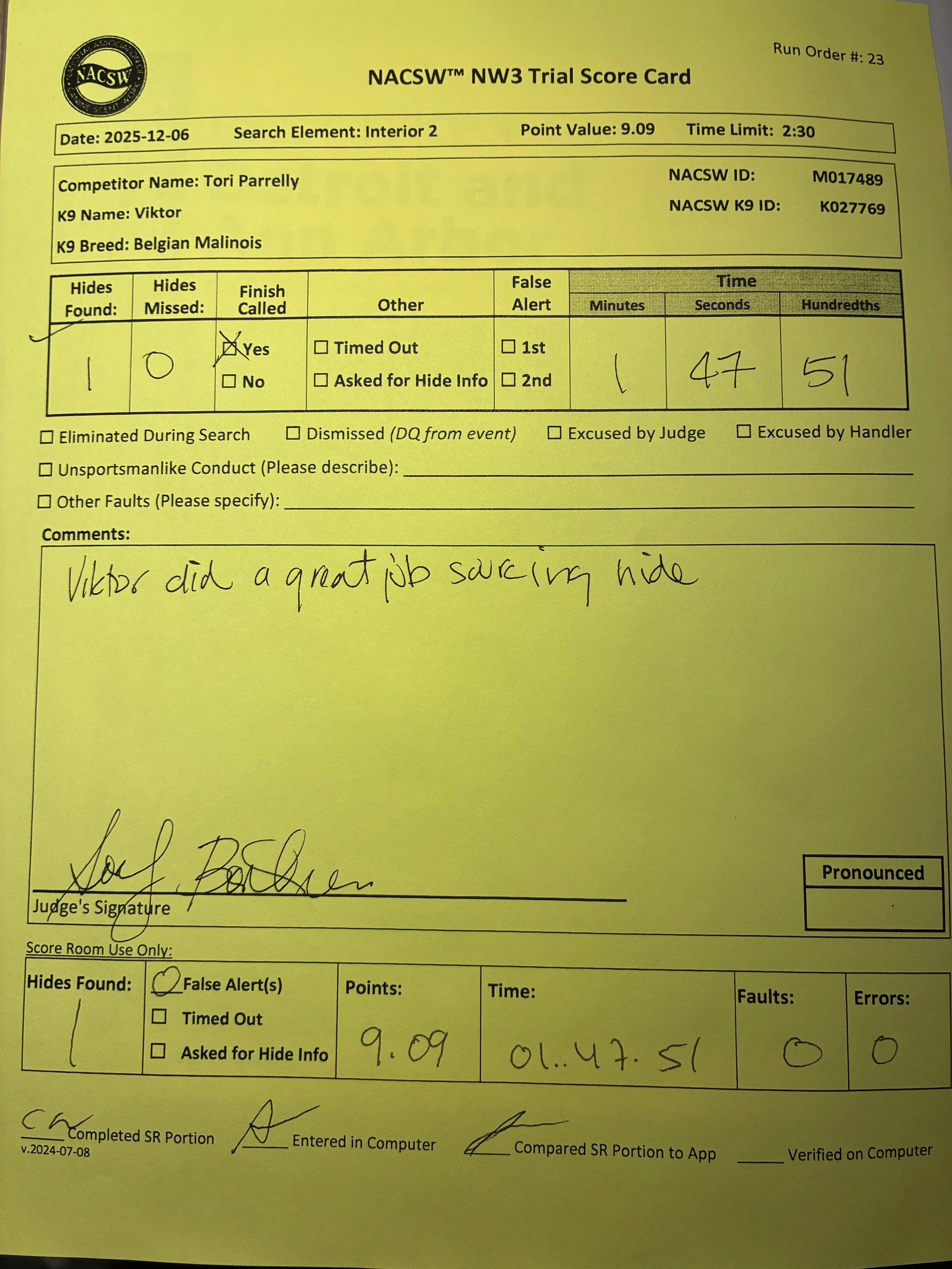 In each search, there will be a range of 0-3 hides. The handler does not know how many hides are in each search, and outside of the judge confirming yes/no when the handler calls alert, you don’t receive feedback on any of your searches until the end of the trial. It’s a big mental challenge for the handler to keep your head on straight all day, not knowing how you’re doing.