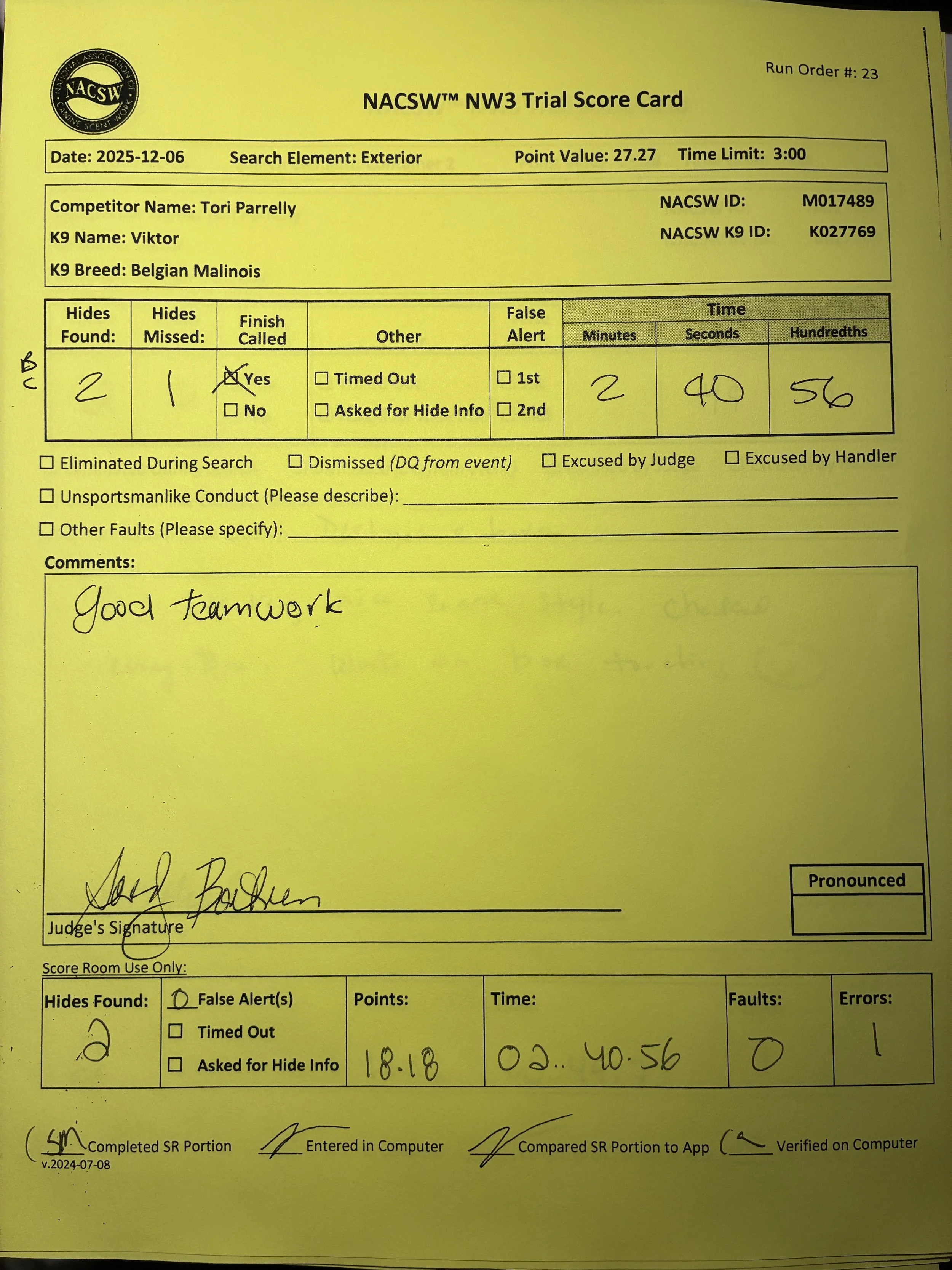 ‘K9 displayed nice focus on task. K9 found hide very quickly with strong alert. K9 has nice, detailed style of hunting. Very nice team.’